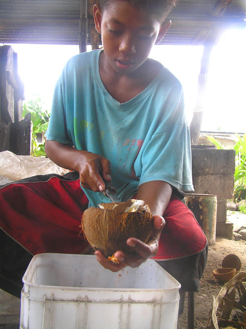 豚にやるココナツを削る 13歳のファトゥ。 わたしと夢さんの親戚だ。 (ホームステイ家族が そのまま家族とみなされる。) このココナツ削りは |
