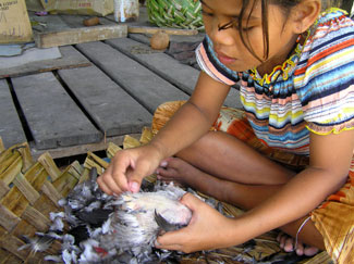 ナツのために野鳩の羽をむしってくれている10歳のライサネ。 |