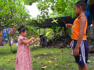 コココナツの葉の風車、「ペカペカ」で遊ぶ夢さんとお隣のイウタナ。 |