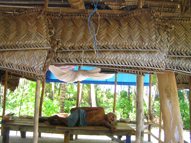 ![]() オシエじいちゃんは、村からはずれた、島の反対側の海沿いの森に、 ひとりで住む。 ある日、自転車で昼ごはんをとどけに行くと、ぐっすりと眠っていた。 家の向こうから、大きなゆっくりとした白波の声と潮風がきていた。 朝には村に来て、村人たちが請うままに、 カヌーを作ったり、ココナツの樹液とりやら プラカ芋づくりやらを教えながら手伝う。 島や一族の集会にも必ずでる。 背筋をしゃんとのばして、洗いざらしのスルー(腰布)を巻いて。 そして樹液とり用の小ナイフを腰にキッとさして、てくてく、森を歩いて帰っていく。 昼ごはんの焼いた飛び魚をむしゃむしゃやりながらおしゃべりをする。 「ばあさんは4年前に死んだ。トト・マールガ(高血圧)でな。 豚をたくさん食べすぎたんじゃよ。がははははは。」 (ツバルの豚が大好きだった夢さんはそれを聞いた後あまり豚を食べなくなった。) 「オシエ。村に住まないの?」とわたしは聞く。 「村はなぁ…、騒がしいじゃろ。ー森は、静かじゃぁ。海の波の音だけじゃ。 ー森はいい。」 昼ごはんを食べると、またゴロンとなった。 「わしゃ、もうちょっと寝るよ。 夕方には起きて、豚と鶏の奴らに、ココナツを削ってやらんといかんからな。」 (ナヌマンガ島) |