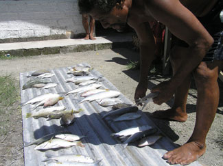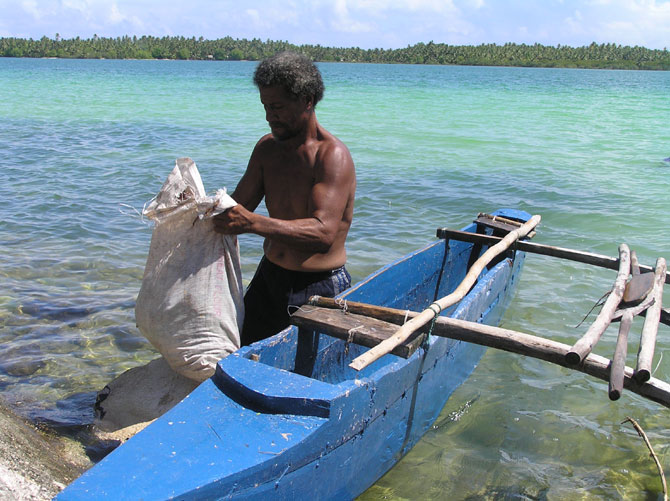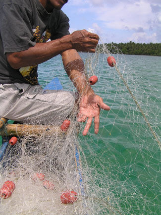 ![]() 島役場「カウプレ」のすぐ裏。バイツプ島の中心をまあるく占める、青いラグーンが広がっている。 カウプレのお雇い漁師であるタウキエが、網漁の魚を揚げている。 |