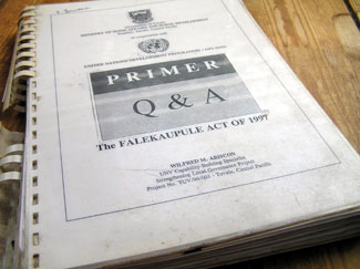 さて、前ページで説明した島集会は、島の中心に建つ一番大きな集会所、マネアパ・アニプレで開かれると述べた。 カウプレには、まず6人の役員、「カウプレメンバー」がいる。彼らはカウプレの会議に出たり顧問的な役割だったりアリキ達との折衝に回ったりするときの非常勤。重役型の存在だ。 長老を中心とする島の自治組織「ファレ・カウプレ」で「こういう方針でいこう」と決まった事柄が、実際に島全体として具体的な遂行係が必要なことなら、島役場カウプレの役員と公務員たちがそれをつかさどる。 たとえば島にひとつである小学校のパンダナス葉屋根のふきかえは、カウプレが、時間の空いている島民を時給で雇って進めていくことにしようー、というように。 または、カウプレ役員達(「カウプレメンバー」)が予算案を出す。予算案は、ファレ・カウプレに提出される。そこで、アリキやオールド・マン達の信任を受けて、はじめて、施行される。 カウプレは、じつは首都のツバル中央政府が各島に設置しているものだ。 だから、ツバル中央政府と、各島とのパイプラインでもあるのだ。 たとえばツバル中央政府が、4月に首都フナフチで全国島対抗子供スポーツ大会を開く。各島から選手となる何十人かの子供達と保護者を招いての、大きな祭りである。 そういった連絡が、中央政府からカウプレにくる。役長(プレ・オ・カウプレ/pule o kaupule/ president of kaupule) は、島の最高長老ウル・アリキにそれを伝える。 そこで、ウル・アリキは島集会を招集する。 島集会で、「では、プラカを300、豚を20頭、鶏を40羽、etc.…を首都フナフチの中央政府に送ろう。」と決定する。 するとカウプレは、島での決定を、中央政府に伝達する。 カウプレにはラグーンで網漁をする3人の漁師もいる。毎日カウプレで揚げられる魚は、ノートに名前を書いておく予約制で、1キロ1.4オーストラリアドル(140円)ごとの公平な分配購入で大人気。 なにせラグーン側での網漁は、カウプレでしかしてはいけない条例なので、刺身にうまいカナセやパネアヴァは、カウプレでしか手に入らない。 それからカウプレ舎にはカフェもあって、いつもいろんな人がラグーンをながめながらくっちゃべっている。 コピーをとりたいときなんかも、カウプレにきてコピー代を払ってやってもらう。 機械工もいて、島民の工具や自転車、バイクも、修理費を払えば修理してくれる。トラックや農機具の貸し出しなんかもしてる。 島はずれには、カウプレ所有の別荘小屋があって、みんな1日10ドル(1000円)の使用料を支払って「ピキニキ」(ピクニック)に使っている。 しかしもちろん国が設置しているものであるから、国庫からの助成金も大きい。 実際、カウプレの7人の事務員のうち、秘書、会計、開発プランナー、コミュニティー・ワーカー、エグゼクティブ・オフィサーという4人の地位の給料は国庫から出ている。 つまり島役場とはいっても彼らは国家公務員、ということになる。 ● ファレ・カウプレとカウプレの歴史 ● 1978年にツバルがイギリスから独立したのち、ツバル政府が各島を統治するために設置したのが、カウプレの前身、「フォノプレ」だ。(fonopule/フォノ=集会・会議、プレ=トップ、頂上) ところが各島にはもともと、前ページの、長老アリキを配する自治システム「ファレ・カウプレ」がでーん、とあるのだ。 そこで中央政府設置のフォノプレと伝統自治ヒエラルキーであるファレ・カウプレは、立場を主張しあって、いがみ合うことが多くなった。 そこで、中央政府は、抜本的な見直しを検討。 そして1997年に国会にて「カウプレ法」を決議。 以後、島の重要事項の決定権は、伝統的なファレ・カウプレに完全に戻した。 島役場フォノプレは「カウプレ」と名前をかえて、実際のプランの施行役と、中央政府との連絡係に徹することになった。
