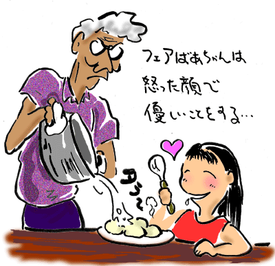 | 日本の育児界では「子供の声を聞こう」という子供の人権尊重の見直しが始まった昨今。でもその人権とは何かの理解の混乱の中で、とりあえず単なる我がままに優しくして、かえって親が小さなことで振り回されるケースが実は多い(と思う)。私もその例外じゃなかった。 ミティは、気の済むまで外で泣き叫んだ後、泣き止んだら家の中に入ってごはんを食べた。ところがこの「退場」処置をつらぬくうちに、ミティ…夢さんは些細なことでは駄々っ子泣きをしなくなった。 ●「子育てはファイゴフィエ(簡単)!」● このフェアばあちゃん、実はこの「ピシッっと子育て」でなんと10人の子供を育ててる。みんなアメリカ本土やハワイで会社を経営したりして、けっこうな仕送りをばあちゃんにかかさない。里帰りしてたその何人かと友達になったが、びっくりするくらいオープンでいい人達だった。これは説得力があった! |